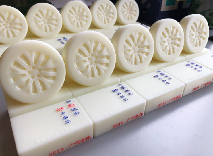 3D打印技术的“如影随形。皓影当空”这是广汽本田用利用车轮元素打造的手机支架,接着用SLA 3D打印机打印出来直接使用。