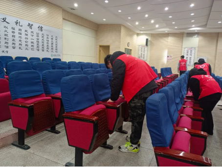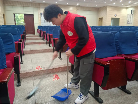 活动开始前,志愿者们利用空余时间,对多余的桌椅进行搬运,按照指定位置把桌椅摆放整齐,调试好灯光和音响。努力保障晚上活动的顺利开展。等同学们陆陆续续进场之后,志愿者们又负责Pu口袋校园的扫码签到并维持会场秩序。活动结束之后,志愿者们分工明确,带着劳动工具来到报告厅,扫地、整理报告厅内器材,收垃圾等。一众忙碌身影的志愿者们,把报告厅的每一个角落都打扫的一尘不染,被打扫过的学术报告厅变得干干净净,焕然一新。