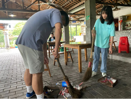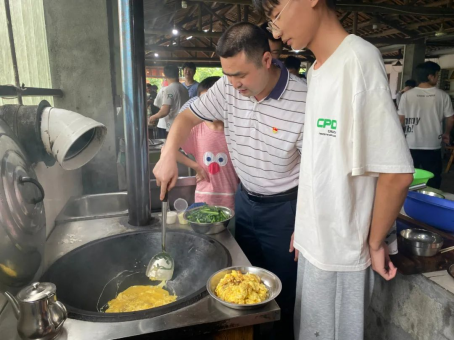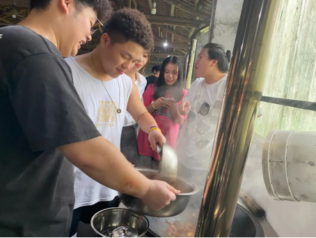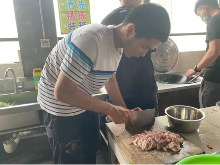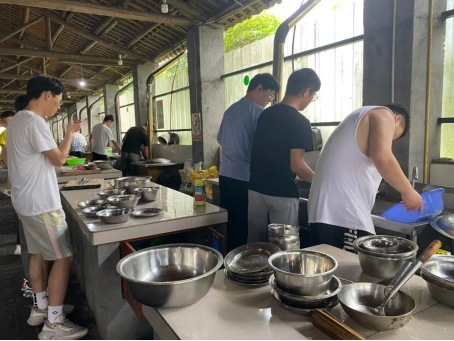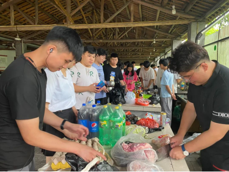 团建之前,部分学生会成员先去附近的菜市场购买食材。到达活动地点后,四十多号人分成五组,组队进行厨艺PK,每组都分工明确,主厨、洗菜、切菜、配菜人员都各司其职。五位“大厨”纷纷拿出看家本领,给大家做了一桌子好菜,整个场面其乐融融。佳肴端上桌,大家就迫不及待地围上桌子,开始享受美味。