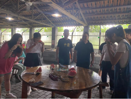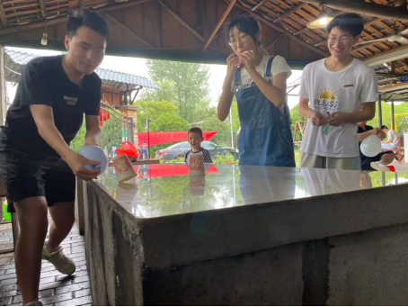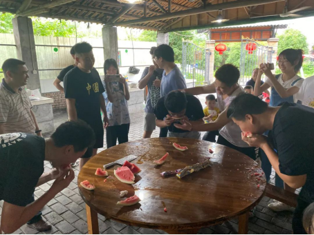随后还精心准备了小游戏——“蒙眼吃西瓜”和“气球吹纸杯”。游戏规则是:两人一组参赛,蒙眼者端着西瓜,站在另一名队友身后(队友坐在凳子上),然后,把西瓜喂给队友吃,先吃完的小组获胜。第二个游戏规则是:参赛人员要迅速用嘴吹起气球,并利用气球的膨胀力撑起纸杯,将起点工作台上的纸杯运至第二张工作台上,并保证纸杯竖立不倒,先完成比赛任务的玩家获胜。这些游戏需要大家的相互配合,让大家通过亲密的身体接触,由此而自发交谈,拉近了彼此之间的距离,让成员们之间关系逐步融洽。