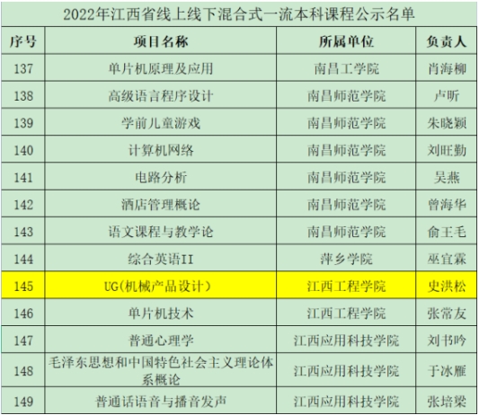 根据《关于2022年江西省线上、线下、线上线下混合式、社会实践一流本科课程认定结果的公示》,我院史洪松院长负责的UG(机械产品设计)课程被认定为2022年江西省线上线下混合式一流本科课程,取得课程建设的新突破。