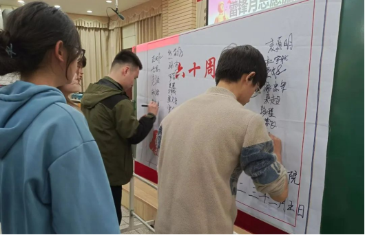 最后,党总支书记范向红带领全体与会人员在“学雷锋志愿服务”签字板上签字。