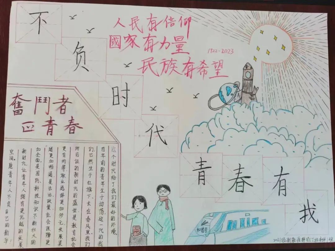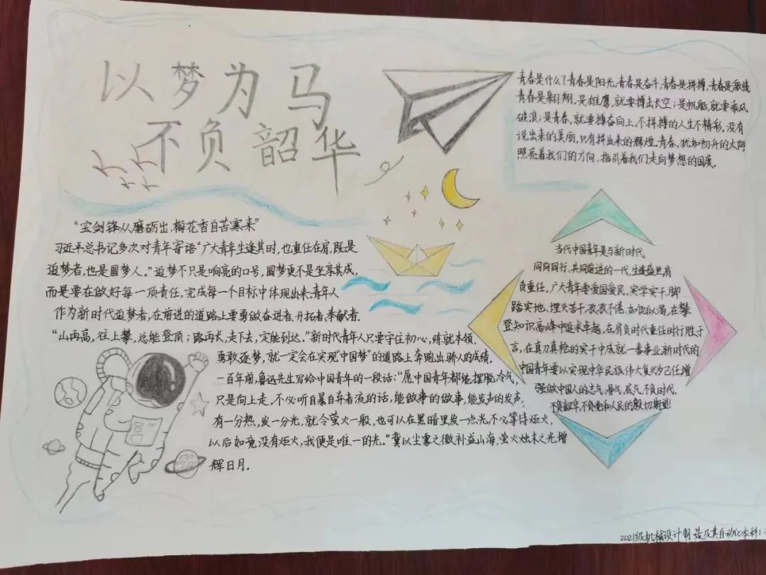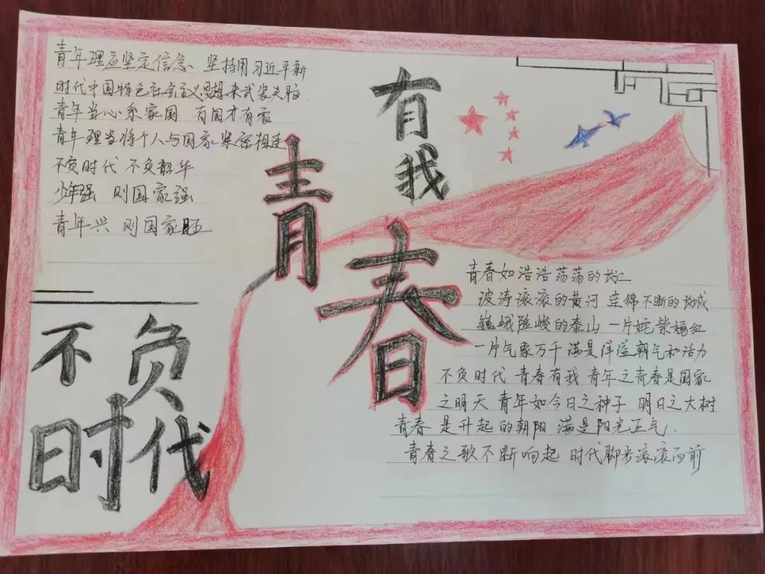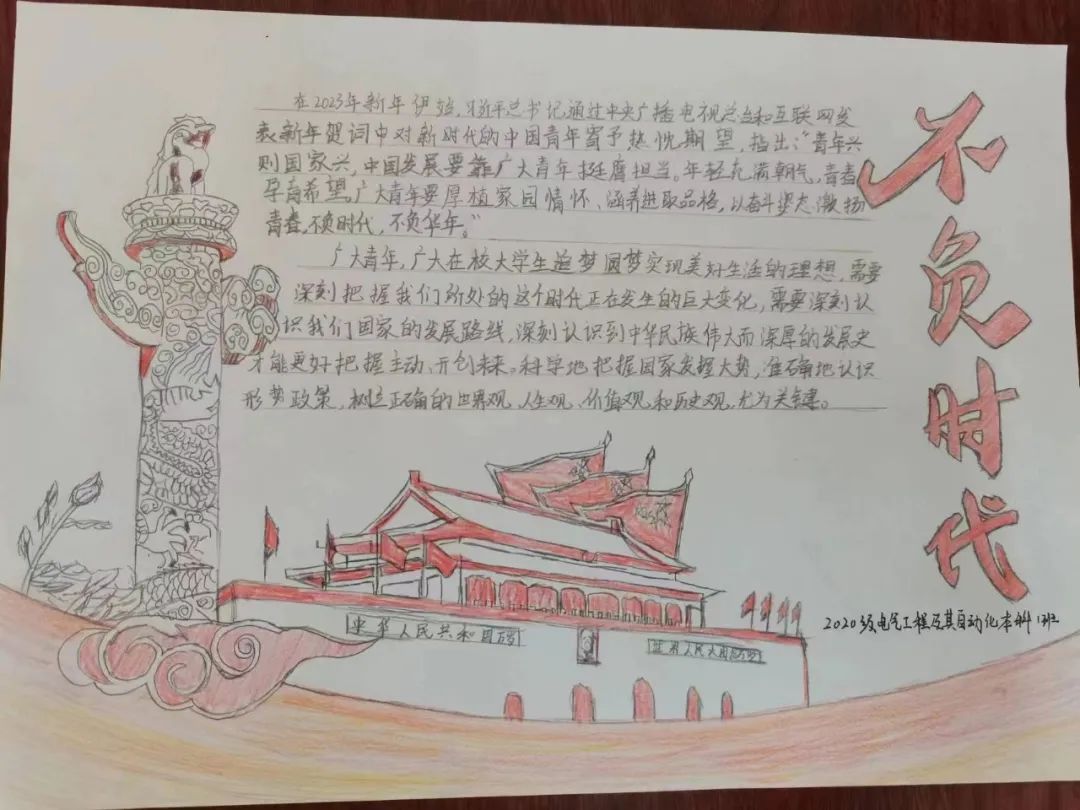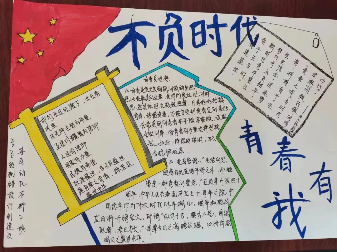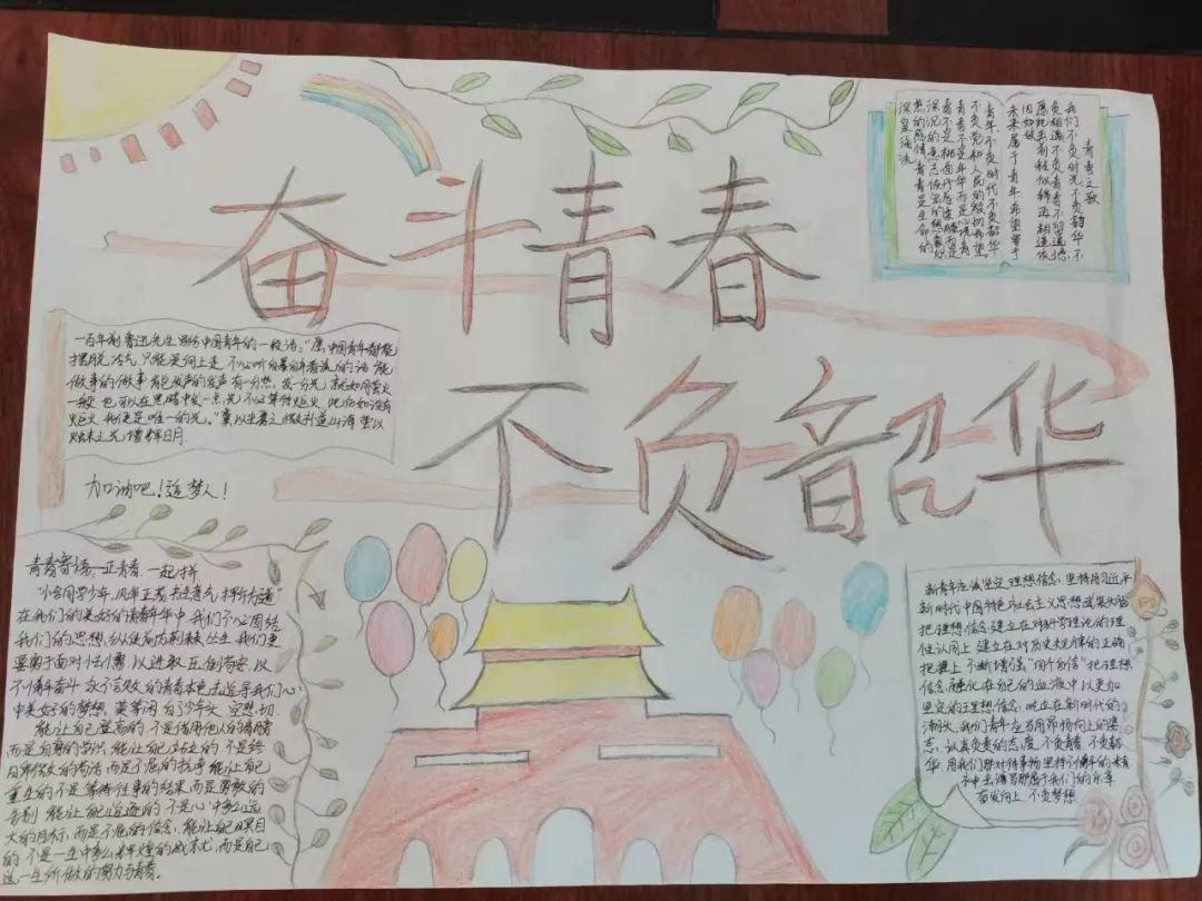 青春激荡,敢拼敢闯,风华正茂,国之栋梁。用青春拥抱时代,在阳光下成长。为全面展现新时代大学生爱党爱国爱民意识,树立远大志向,培养美好心灵,努力学习,全面发展,勇于开拓进取的精神面貌,2023年五月,学院举行了“不负时代,青春有我”手抄报评比活动,同学们以这样的方式奋斗现在,展望未来。
