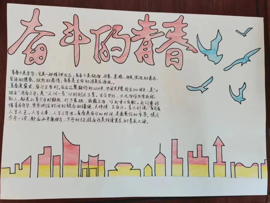 奋斗新时代,青春正当时。手抄报的形式可以更加充分体现同学们的内心世界。本次比赛得到了同学们的大力支持和广泛参与,同学们积极报名,以昂扬青春活力,建设美丽国家,对未来的美好追求、憧憬与向往等为主题进行构思,寻找素材,认真布局排版,在纸上用色彩表达自己的内心,用文字表达了对未来生活的期待。每张手抄报上都体现了同学们对未来的向往和对建设国家的信心。