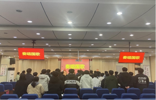 全体起立,奏唱国歌。激昂的歌声充分彰显了全体师生对党和国家的热爱,展现出勇往直前的气魄。