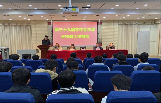 由第39届团总支学生会主席王东做2022-2023年度学生会工作总结报告。他的话语坚定有力,为新一届学生会成员分享工作经验。