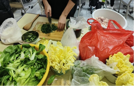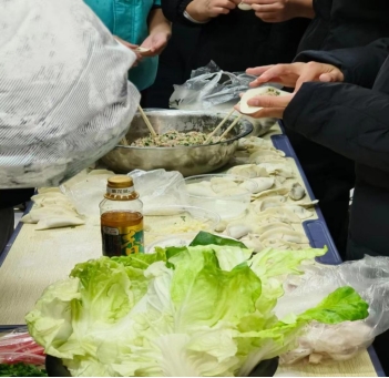 食堂师傅在现场进行包饺子教学,同学们分组学习包饺子;完成后一起吃饺子。
