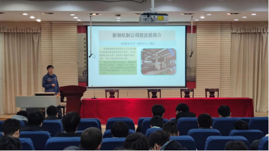 方总通过对新钢集团机电设备修造园项目的建设为核心,向在场的同学们详细描述了新技术应用与新钢机制公司所取得的成果。分别讲述了新钢机制公司技改前基本情况、新钢集团修造园项目概况、建设内容、修造园完成后的生产规模以及与英国威廉集团进行校企合作联手打造开放式教学情况等。