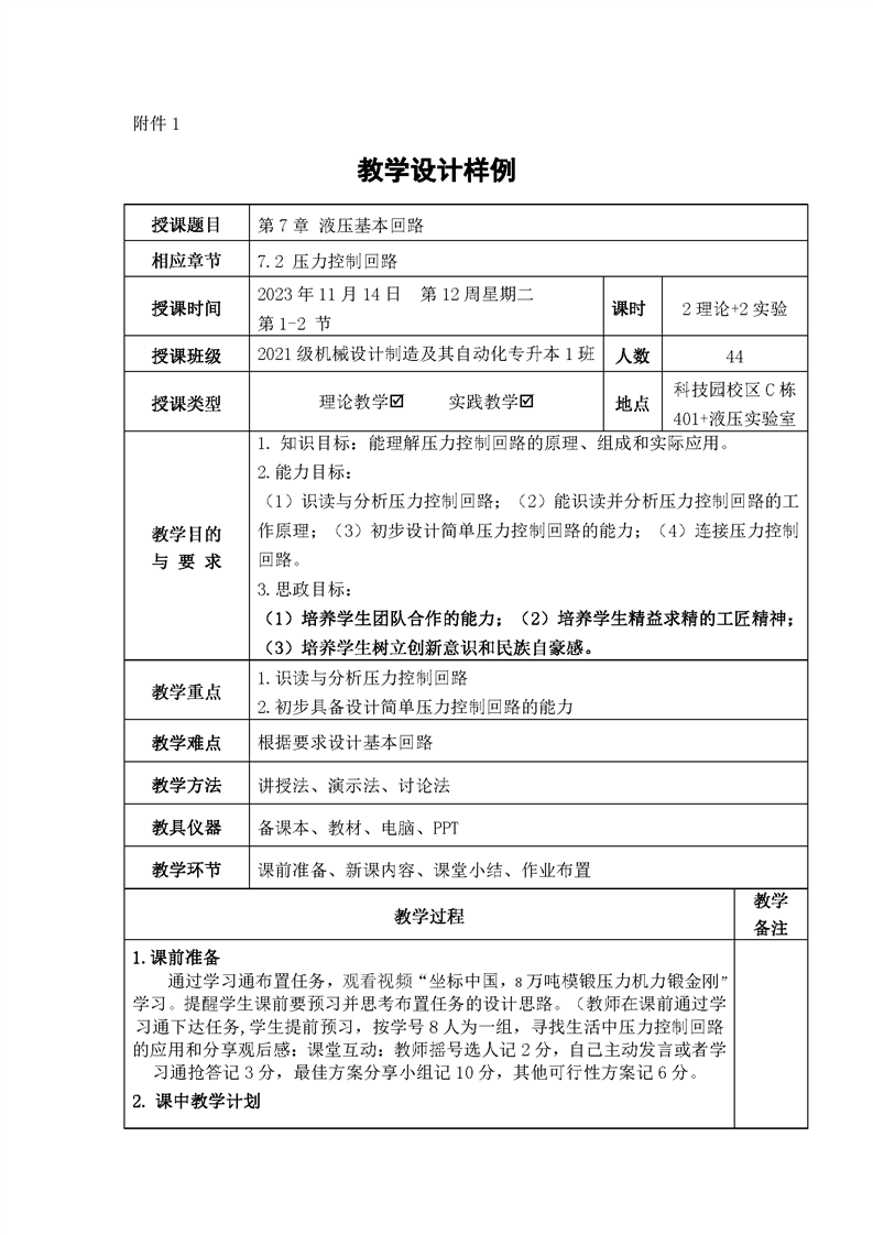 【“课程思政”示范课程】李小梅《液压与气压传动》教学设计样例
