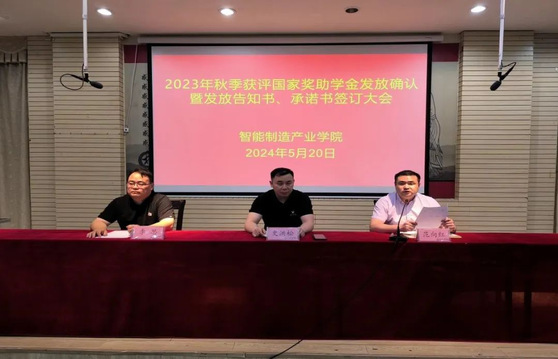 为贯彻落实国家资助政策,确保我院2023年秋季国家奖助学金发放到位,引导学生合理使用国家奖助学金,激励广大学生勤奋学习、努力进取。2024520日,智能制造产业学院在仙女湖校区一楼学术报告厅召开2023年秋季获评国家奖助学金发放确认暨发放告知书、承诺书签订大会。会议由党总支书记范向红主持,院长史洪松、党总支副书记李思及全体辅导员和各班获评国家奖助学金的同学参加本次大会。