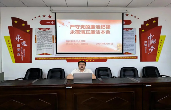 为深入学习贯彻习近平总书记关于党纪学习教育的重要讲话和重要指示精神,引导全体党员懂法纪、明规矩、知敬畏、存戒惧、守底线。2024619日,智能制造产业学院党总支书记范向红在仙女湖校区B104会议室讲授“严守党的廉洁纪律 永葆清正廉洁本色”主题党课,全体党员参加。
