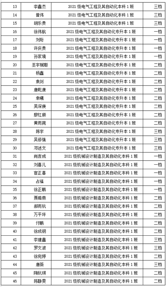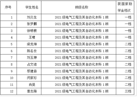 根据《江西省财政厅关于下达2024年学生资助补助经费省级预算的通知》(赣财教指[2024]28号)、《关于做好2024年高校本专科生国家奖助学金评审及资金发放工作的通知》(赣助中心[2024]15号)、《关于做好我校 2024-2025学年家庭经济困难学生认定和建档工作的通知》(校政学字[2024]33号)和《关于2024-2025学年国家助学金评选的通知》(校政学字[2024]40号)文件精神。为激励普通本科高校、高等职业学校学生勤奋学习、努力进取,在德、智、体、美、劳方面得到全面发展。我院严格按照上级有关文件的精神,结合本院实际情况,综合考虑。在我院评审工作小组的认真部署下,各班级按照学校下发文件的相关要求,严格遵循“三公”评议原则——公平、公开、公正,认真有效地完成了2024-2025学年国家助学金评选工作。最终拟推荐我院2021级电气工程及其自动化本科1班刘炎生等340名学生获评2024-2025学年度国家助学金,进行全院公示五个工作日,现将获评学生名单公示如下: