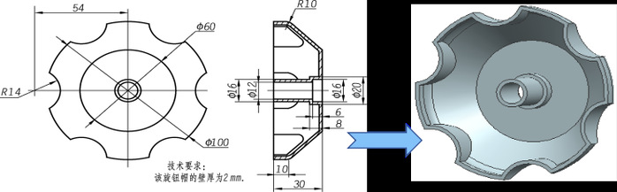 先使用“回转”命令创建旋钮的基体部分,然后使用“圆角”、“拉伸”、“实例特征”、“抽壳”和“孔”等命令为基体部分添加其他特征,以得到旋钮模型。