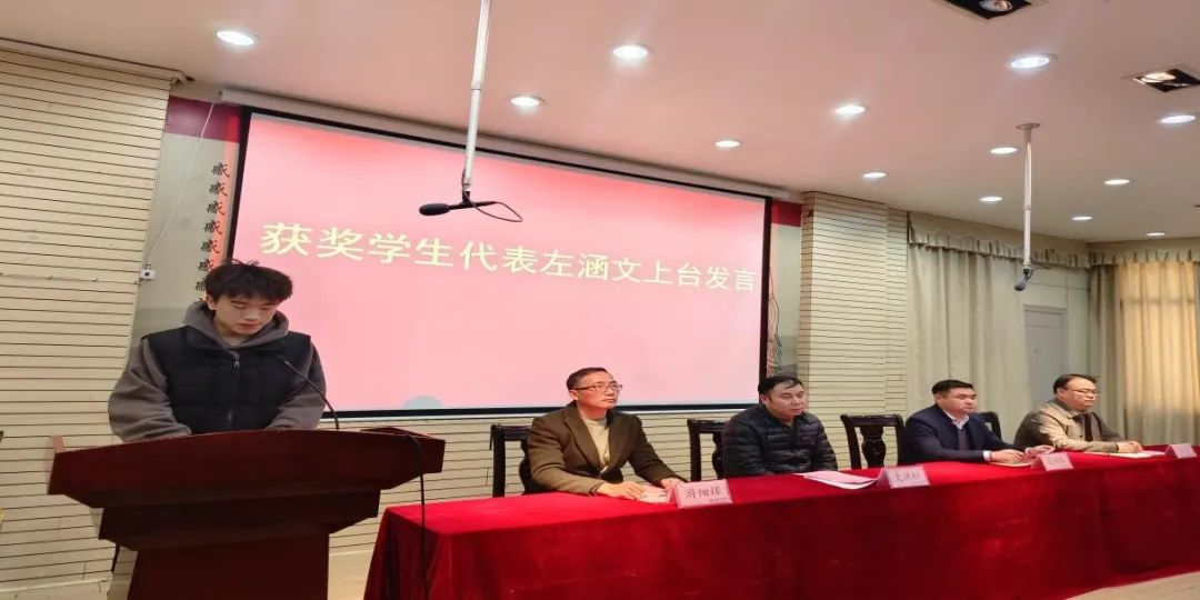大会第五项:获奖学生代表左涵文上台发言,他表示:站在青春的舞台上,我们以风雨后的坚韧笑容,勇敢承担起时代赋予的责任。荣誉和成绩属于过去,未来需要我们继续努力。我将不忘初心,持续学习,以满腔热情和积极心态,为同学们服务,脚踏实地做好每一件事。作为学生干部,我深知自己的模范带头作用,将用实际行动引领大家,共同追求卓越,为集体贡献力量。让我们携手前行,在新的起点上,共创辉煌。