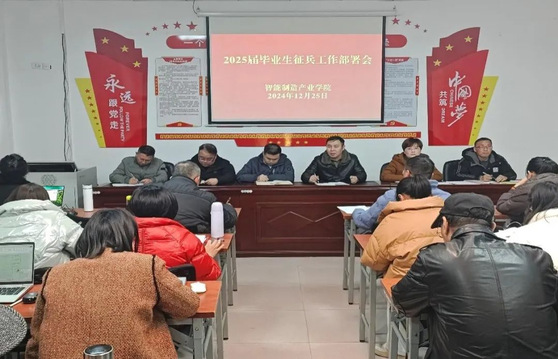 为积极响应国家征兵号召,向部队输送高素质人才,扎实推进2025届毕业生征兵工作。2024年12月25日,智能制造产业学院在仙女湖校区B栋104会议室召开2025届毕业生征兵工作部署会。会议由院长史洪松主持,党总支书记范向红、副院长彭秋梅、党总支副书记李思及全体教师参加。