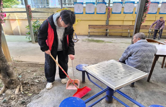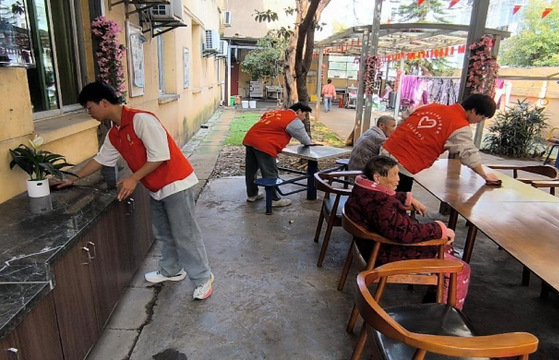 活动伊始,志愿者们进入休养中心,一种岁月静好的氛围感扑面而来。志愿者将带给老人们的牛奶、面包等慰问品交给休养中心管理员。在简单了解了这里的情况后,志愿者们拿上工具,带着满腔热情对老人们的活动设施和居住环境进行了细致的打扫。老人们看着志愿者们打扫的背影,流露出欣慰的笑容。