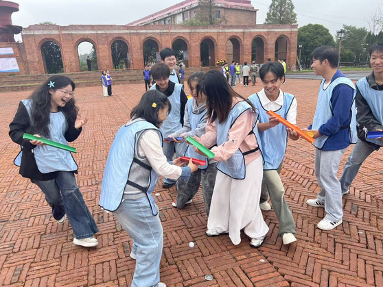 在讨论环节结束后,老师带领大家进行游戏环节。在“同心击鼓”项目中,9名同学协力控制鼓面颠球,领悟团队协作的平衡之道;“珠行万里”挑战中,乒乓球在弯曲管道中精准传递,培养专注力与抗压能力。辅导员付振一全程参与指导,引导学生将活动感悟转化为专业学习的动力。