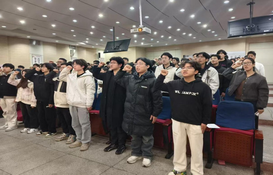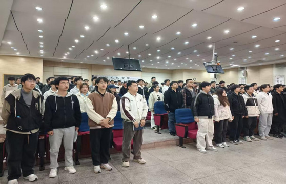 全体起立,奏唱国歌。当激昂的国歌旋律响起,同学们挺直了脊梁,目光坚定地注视着前方,高亢的呐喊充分展现了同学们对党和国家的深情,彰显出奋勇向前的胆气。