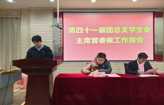 由第41届团总支学生会主席曾睿作2024-2025年度学生会工作报告。他的话语铿锵有力,每一个字都仿佛带着坚定的信念,回荡在会场的每一个角落。“过去一年的成绩既离不开每一位同学的支持与参与,也离不开每一位学生会成员的辛勤付出。在这里,我要向大家表示衷心的感谢!”台下响起了热烈的掌声,这是同学们对过去一年学生会工作的认可。