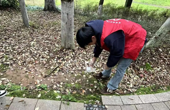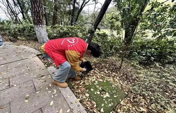 清扫行动中,学生党员始终冲锋在前,以实际行动诠释担当。主干道上,党员们手持扫帚弯腰清扫,落叶、烟蒂等杂物被迅速归拢装袋,他们额角的汗珠与挥动工具的身影,成为公园里最动人的风景;绿化带中,党员们蹲下身,用夹子仔细夹出藏匿在草丛、花丛中的塑料袋、果皮等垃圾,不放过任何一个卫生死角;休息区里,党员们不仅主动承担擦拭座椅、清理垃圾桶周边污渍等脏活累活,还向过往游客宣传环保理念,引导大家共同爱护公园环境。志愿者们在党员的带动下热情高涨,分工协作、相互帮助,在默契配合中凝聚起强大的集体力量,将“奉献、友爱、互助、进步”的志愿精神与雷锋精神融入每一个行动细节。